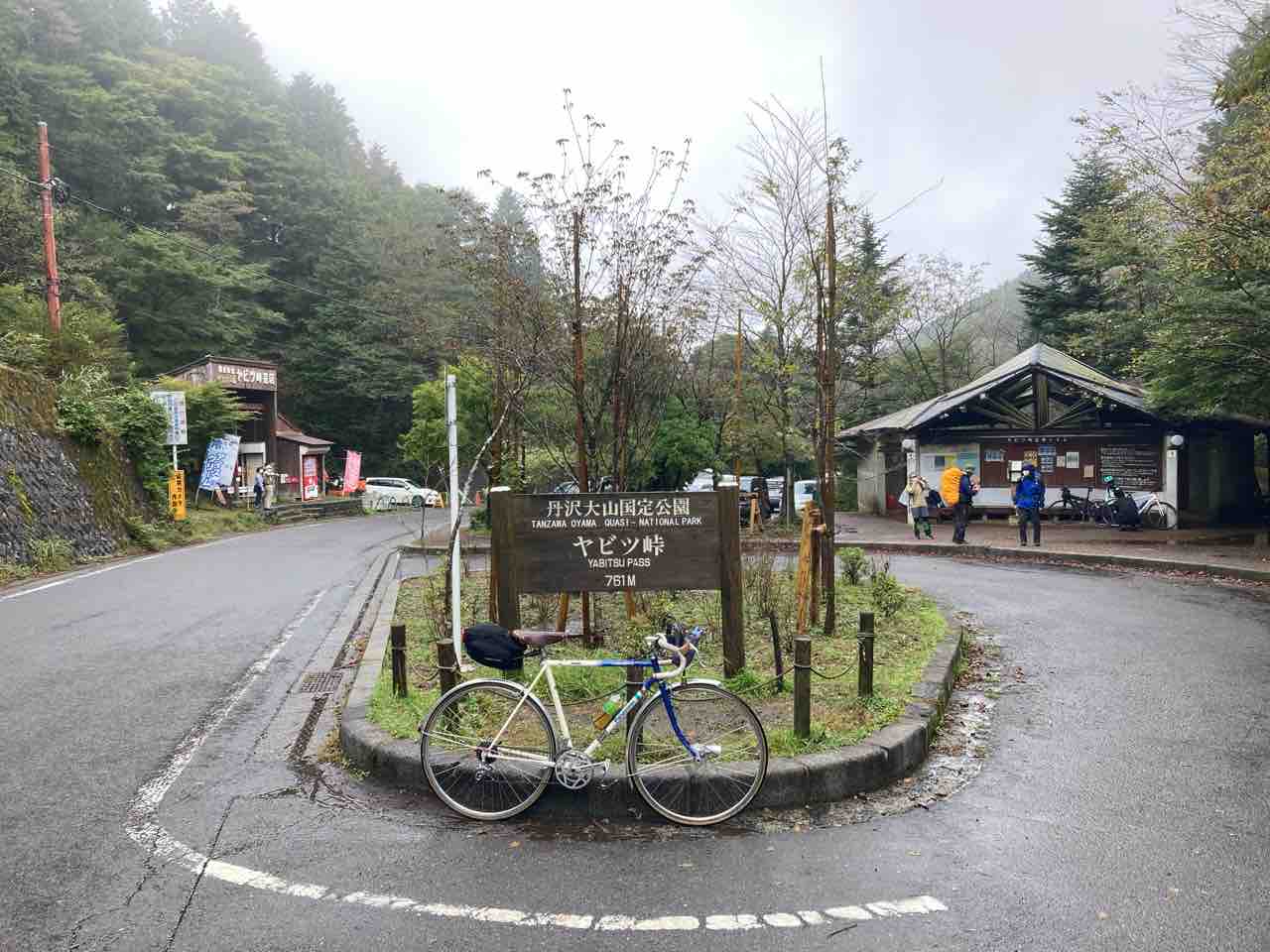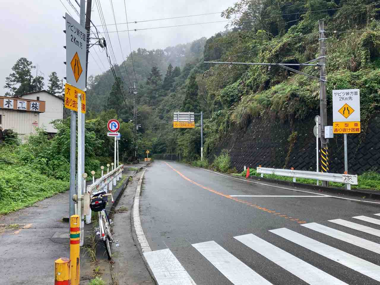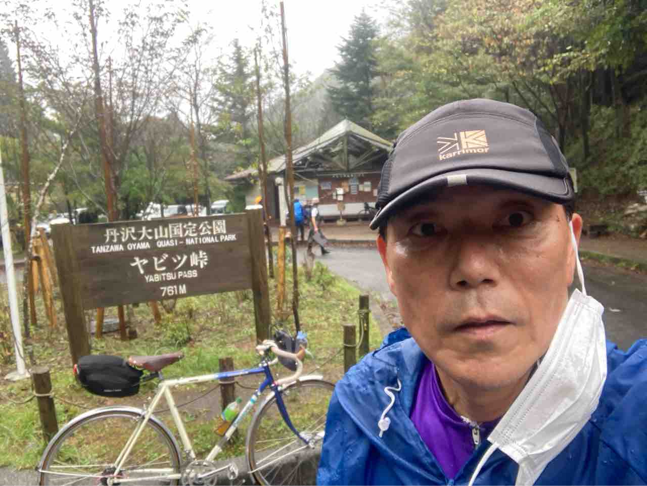 ↑湖畔を漕いでいよいよヤビツの登口にはいる。確かに通せんぼの標識はない。夥しい数のロードバイクが左折して行った。雨がかなり激しい!レインヤッケを着込む。