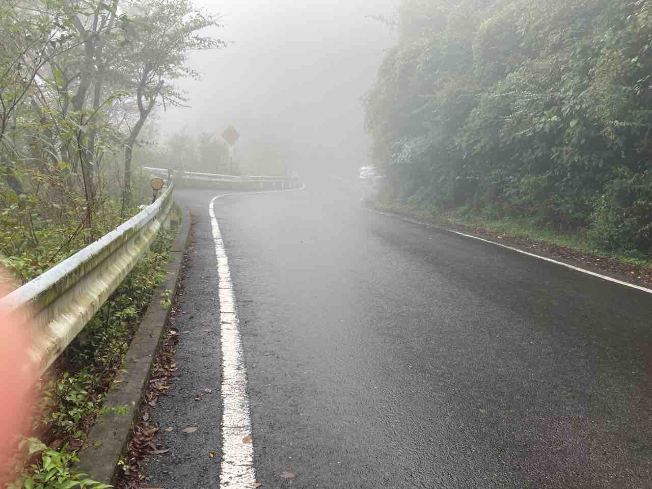 ↑さあ下りだ。雨は完全に止んだ。視界はこんなモン。対向車はライト点けて登ってくる。路面はウェットなんで、気をつけねばならぬ。ちなみにあたしは胸やけでウェップだ。