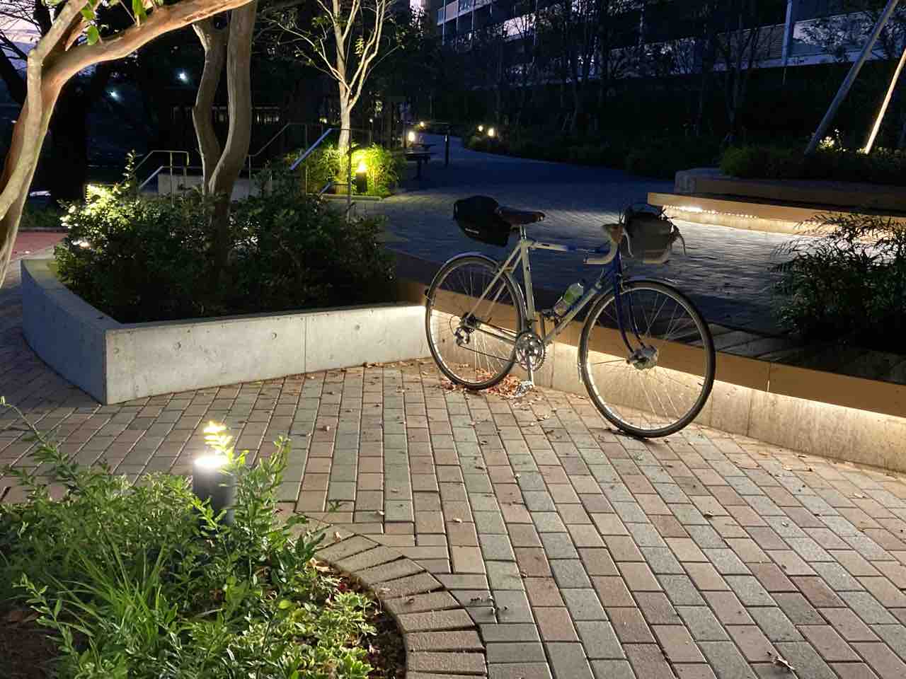 ↑上郷辺り!もう真っ暗だ。プロムナードなんで、散歩の人も結構いる。あたしも徐行はしているが、身を守るために歩行者も灯り持ってた方がいいかも。