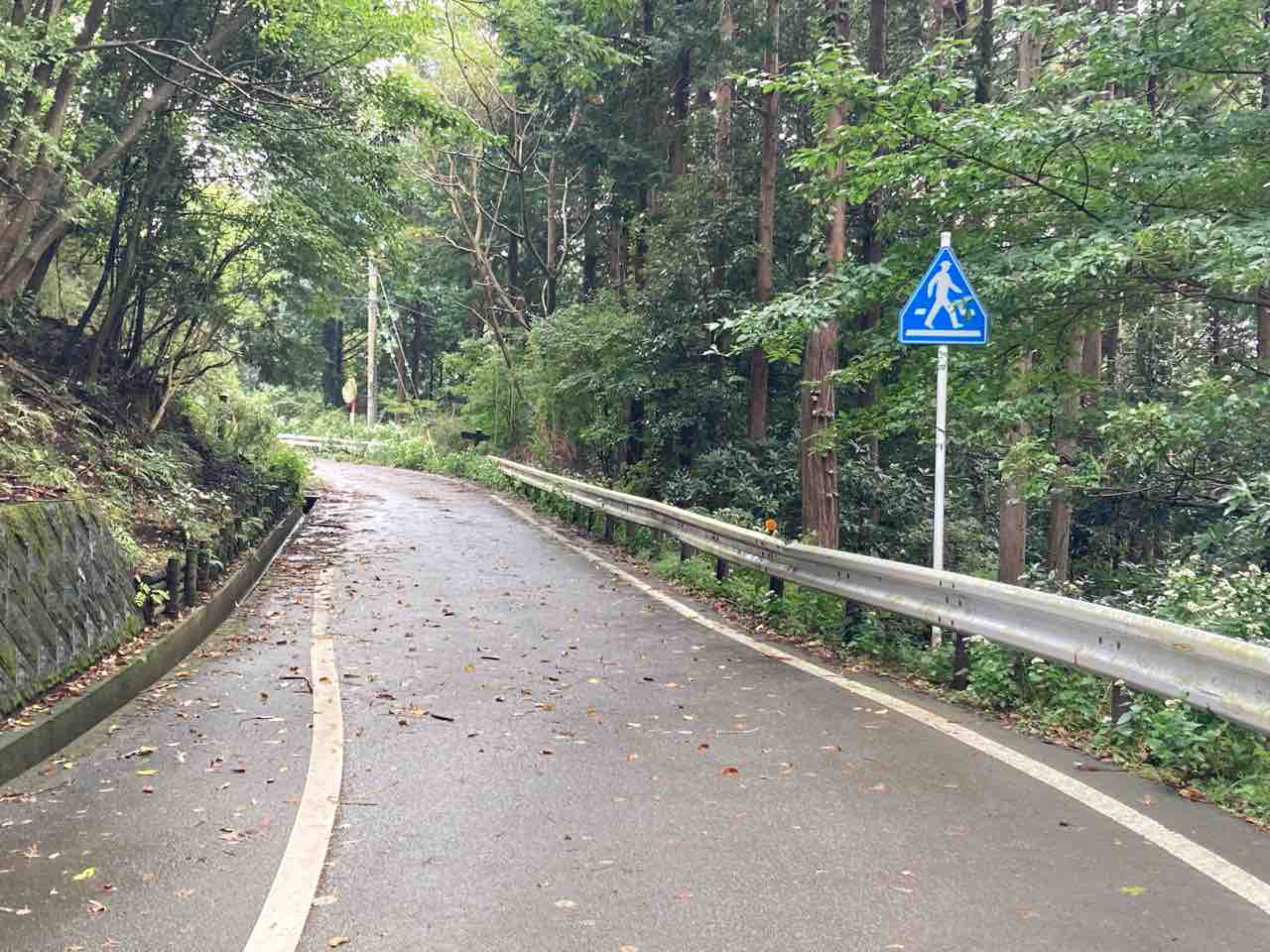 ↑こんなやまんなかに? 不思議に思っていたら、この先を登山道が横切っており、横断歩道まで描かれてあった。登山道はこの先も何箇所か横断しているが、標識と横断歩道があったのはこの場所だけ。なんとも中途半端な行政の仕事である。