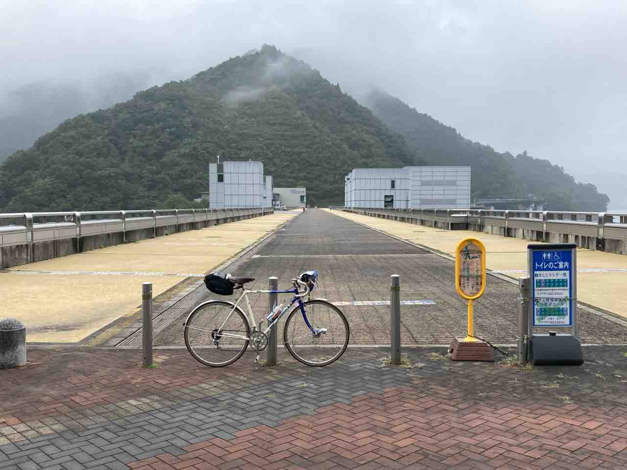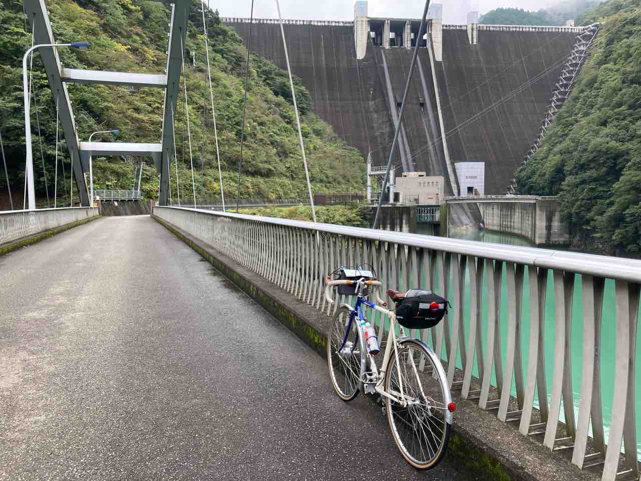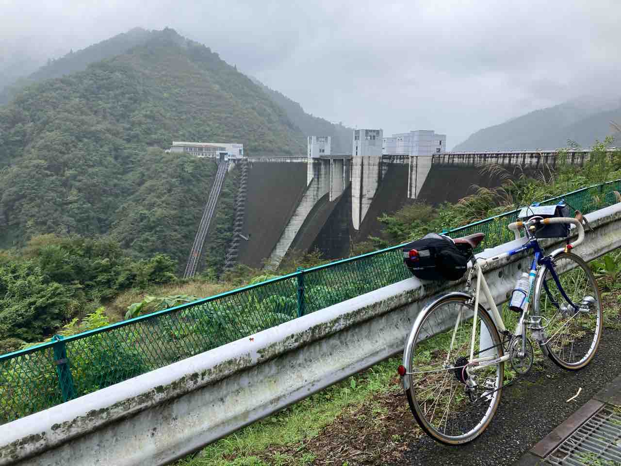 ↑石小屋ダム上部。右手が下流、左手は上流にあたる。左前方にパナもん太700C輪行車がちっこく写り込み。