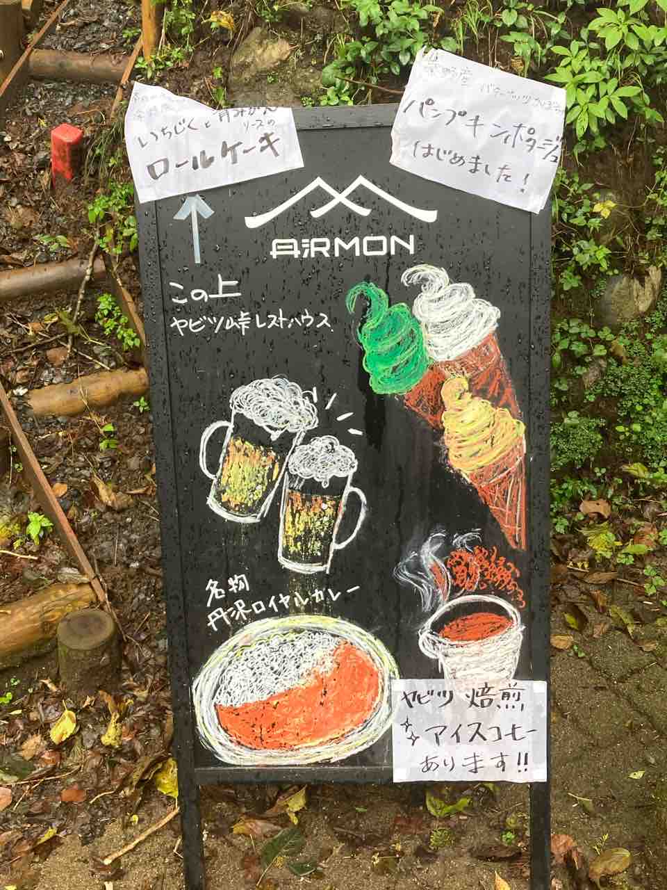 ↑身体が濡れてるんで、いまお店には入りたくないなぁ〜というコトで、下まで我慢する事にする。甘いモンも食ったしで、そんなに腹は減ってない。ちなみにそのレストランは、バス停脇の木段登って直ぐだ。