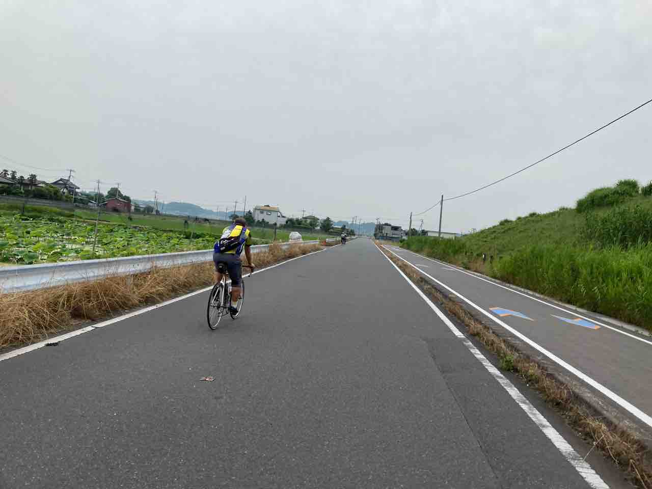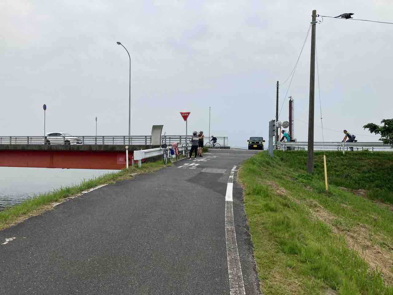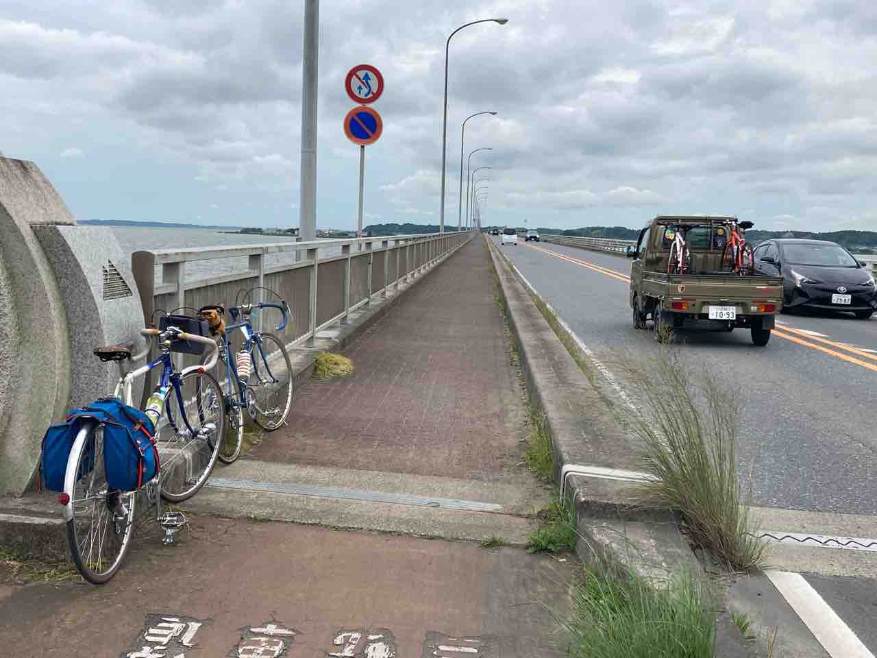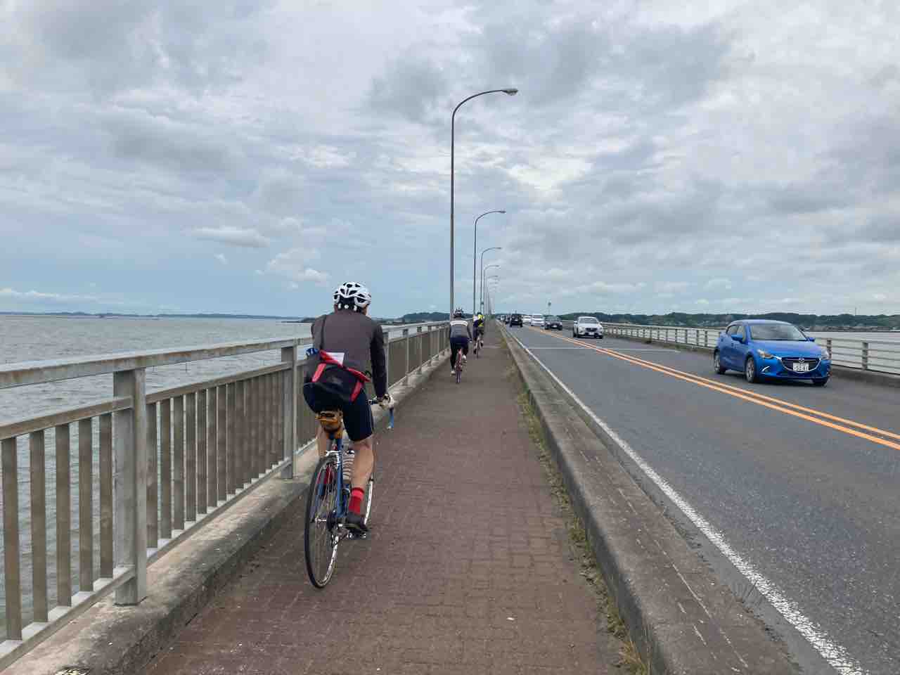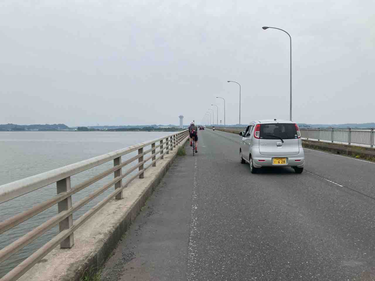 霞ヶ浦大橋までは国道354を行く。自由走行!とのことなんで、マイペースで橋の袂まで漕ぐ。ちょろっと向かい風で、緩い起伏が続く。変速機の調子が相変わらずのイマイチでイラつくなぁ〜