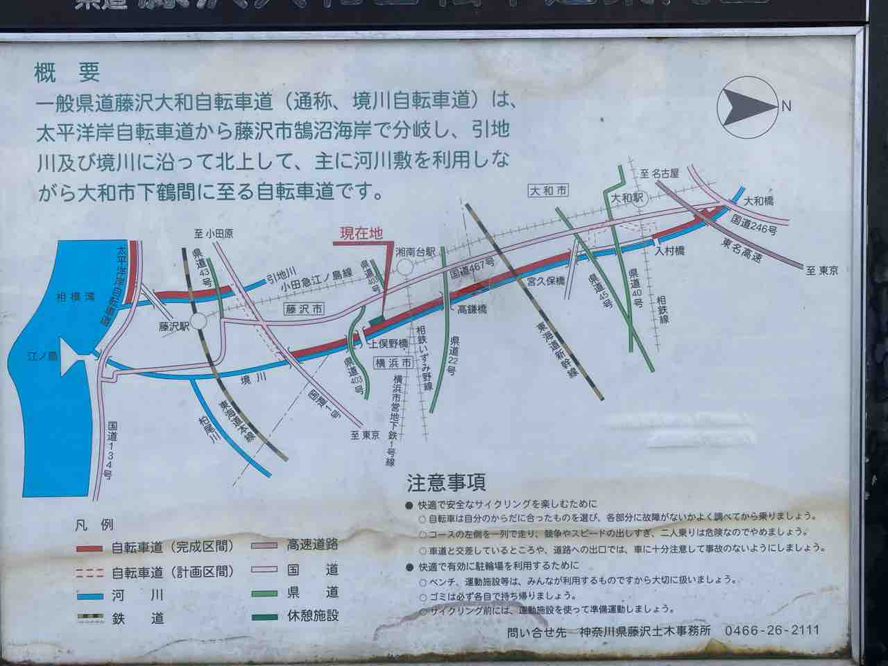 藤沢市民病院の辺りからは其れらしくなってきて、サイクリスト達を見かけるようになる。ロード、MTB、ママチャリ、ミニ等に混じって泥除け付きのツーリング車もちらほらである。以前に比べるとマナーも良くなり、安心して漕げるようになったが、相変わらずのお調子者もいる。ココはレース場じゃないんですよ。こういう方は、速度を落とすのが苦手なようである。