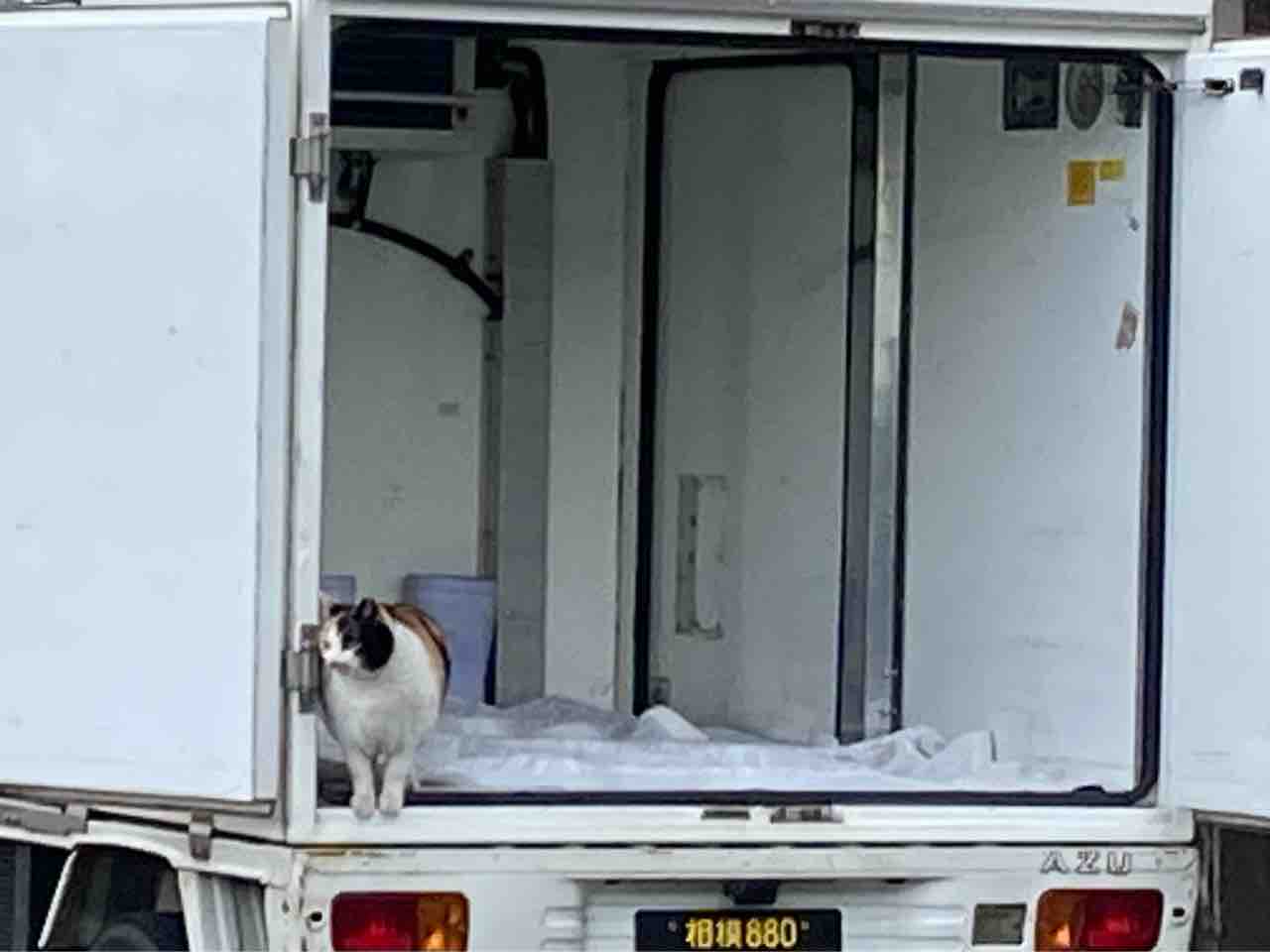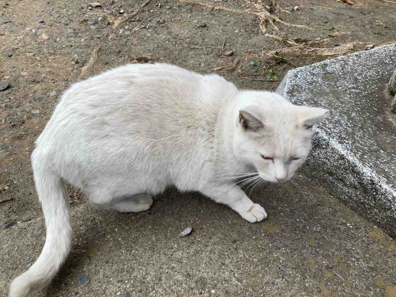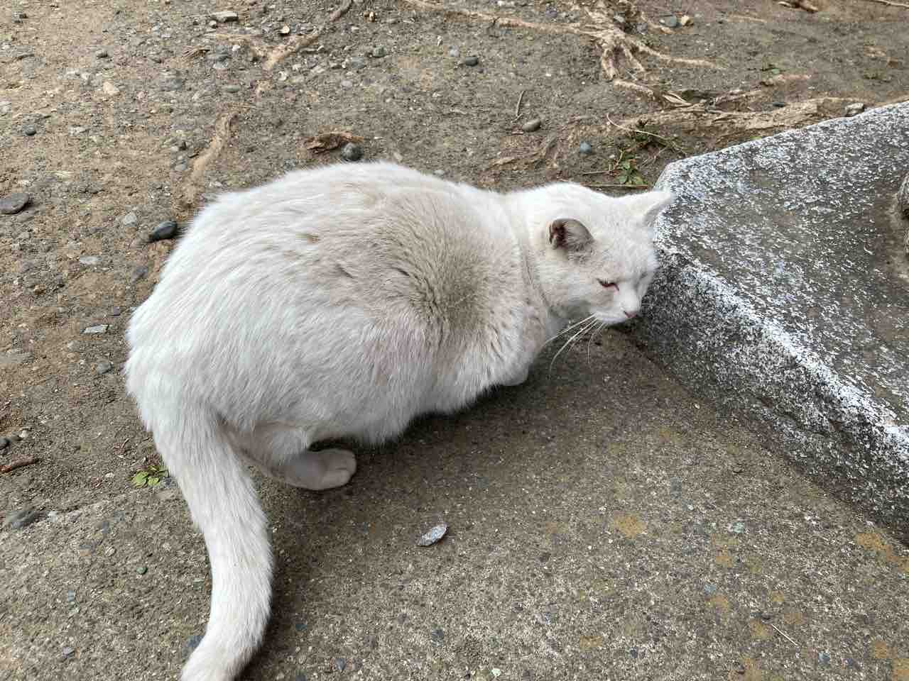 ↑今日はたくさんのにゃーにで会ったが、触らしてくれたのはこのシロと、パネルバンに忍び込んだミケだけである。