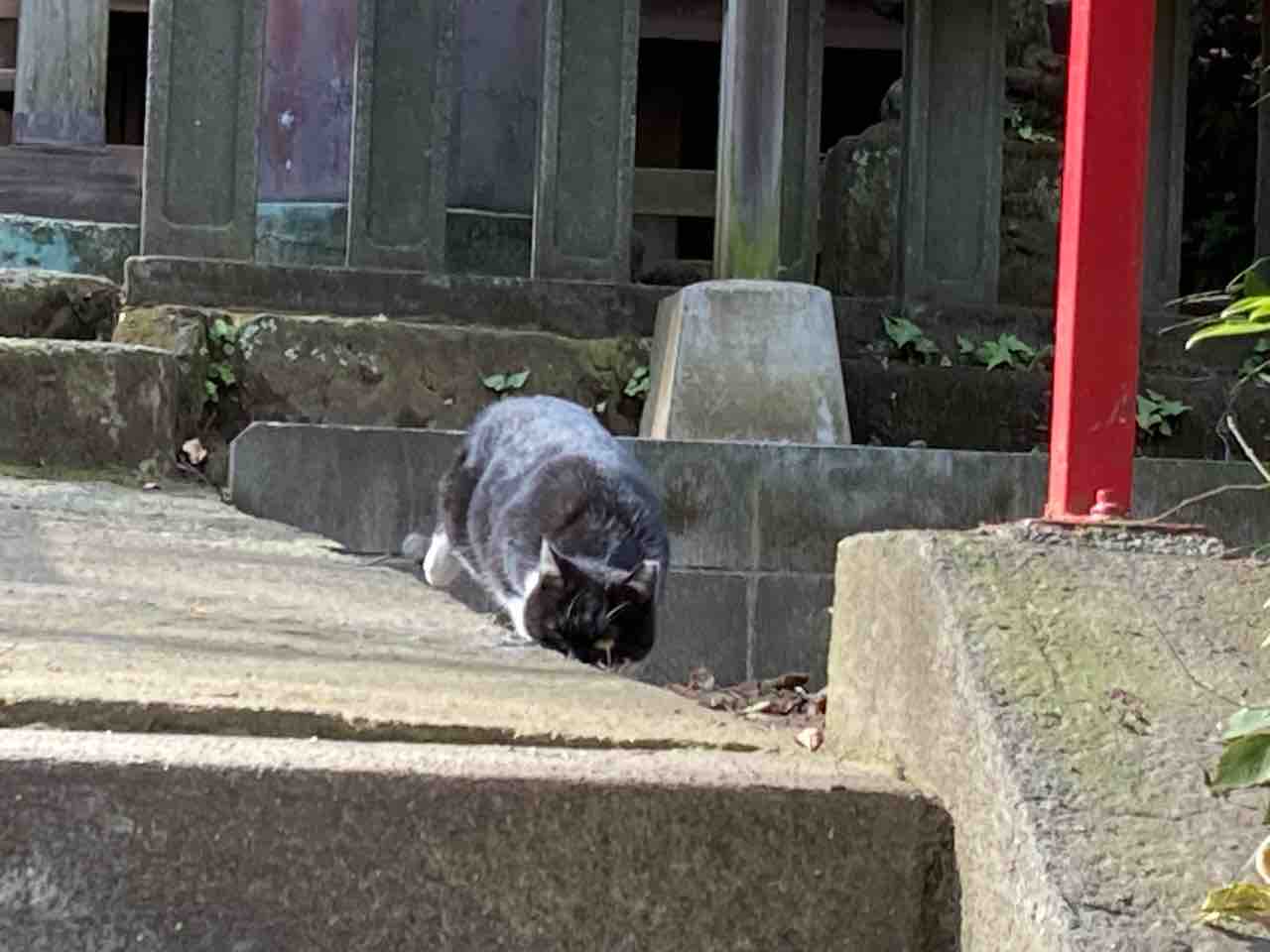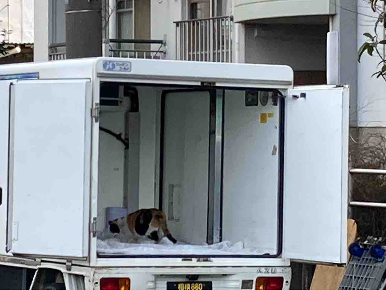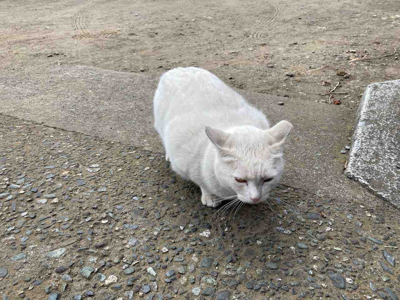 ↑今日はたくさんのにゃーにで会ったが、触らしてくれたのはこのシロと、パネルバンに忍び込んだミケだけである。