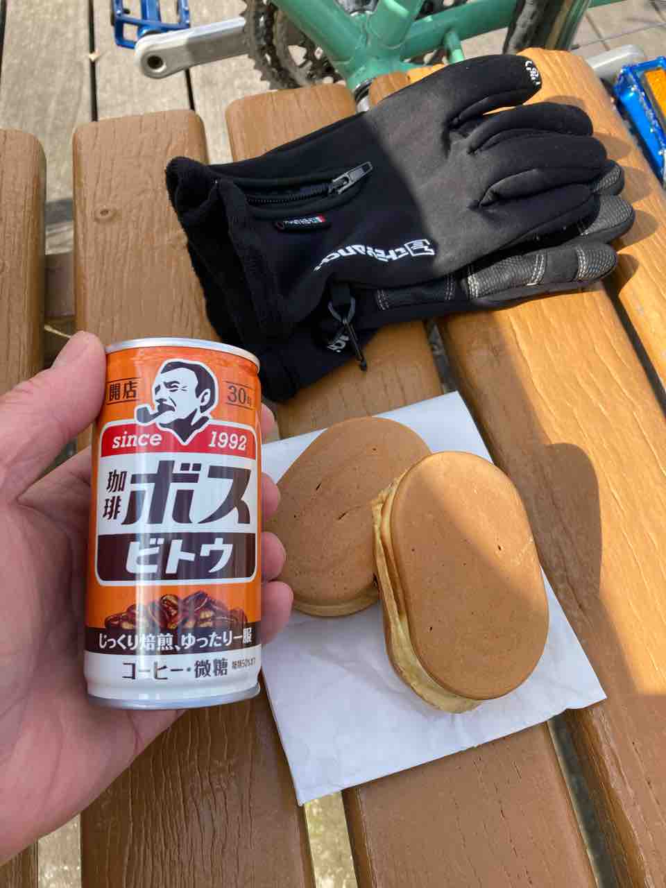 ↑黄金焼とボスビトウでもぐもぐタイム!ボス缶のデザインがステキ!