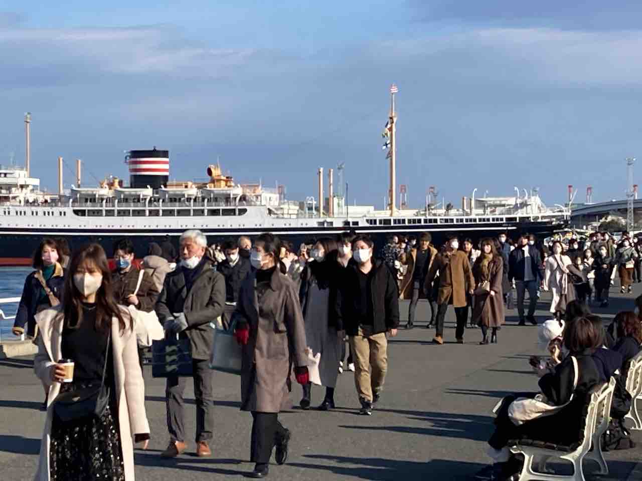 山下公園はかつての賑わいというか、それ以上の人の多さですね。マスクしている人は多いみたいですが、政府から「そろそろマスク解禁するよ」というお墨付きをもらったからでしょう。