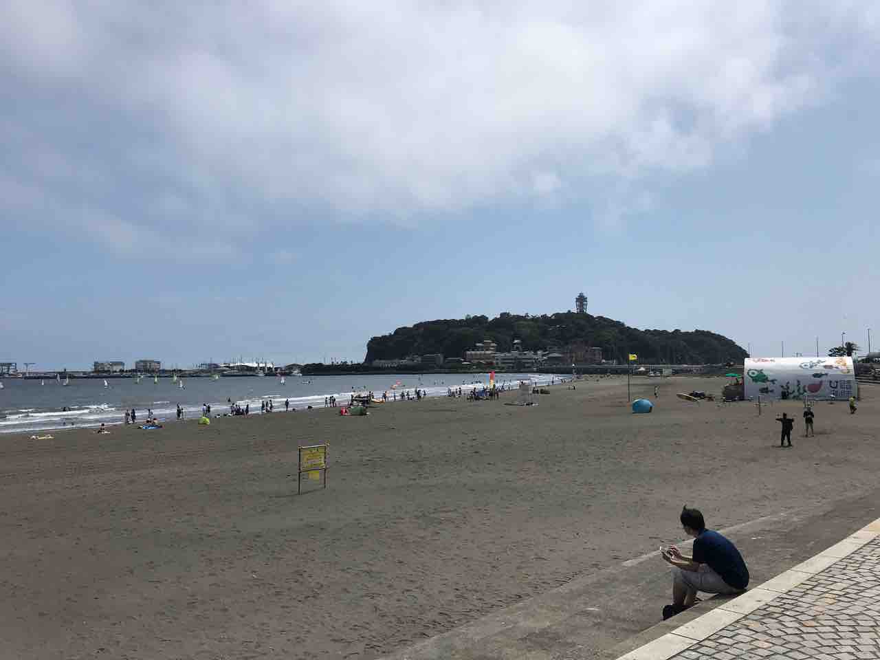 ↑東浜から江ノ島を望む。今年は海水浴場は開かないそうだが、結構な人数が泳いでいた。