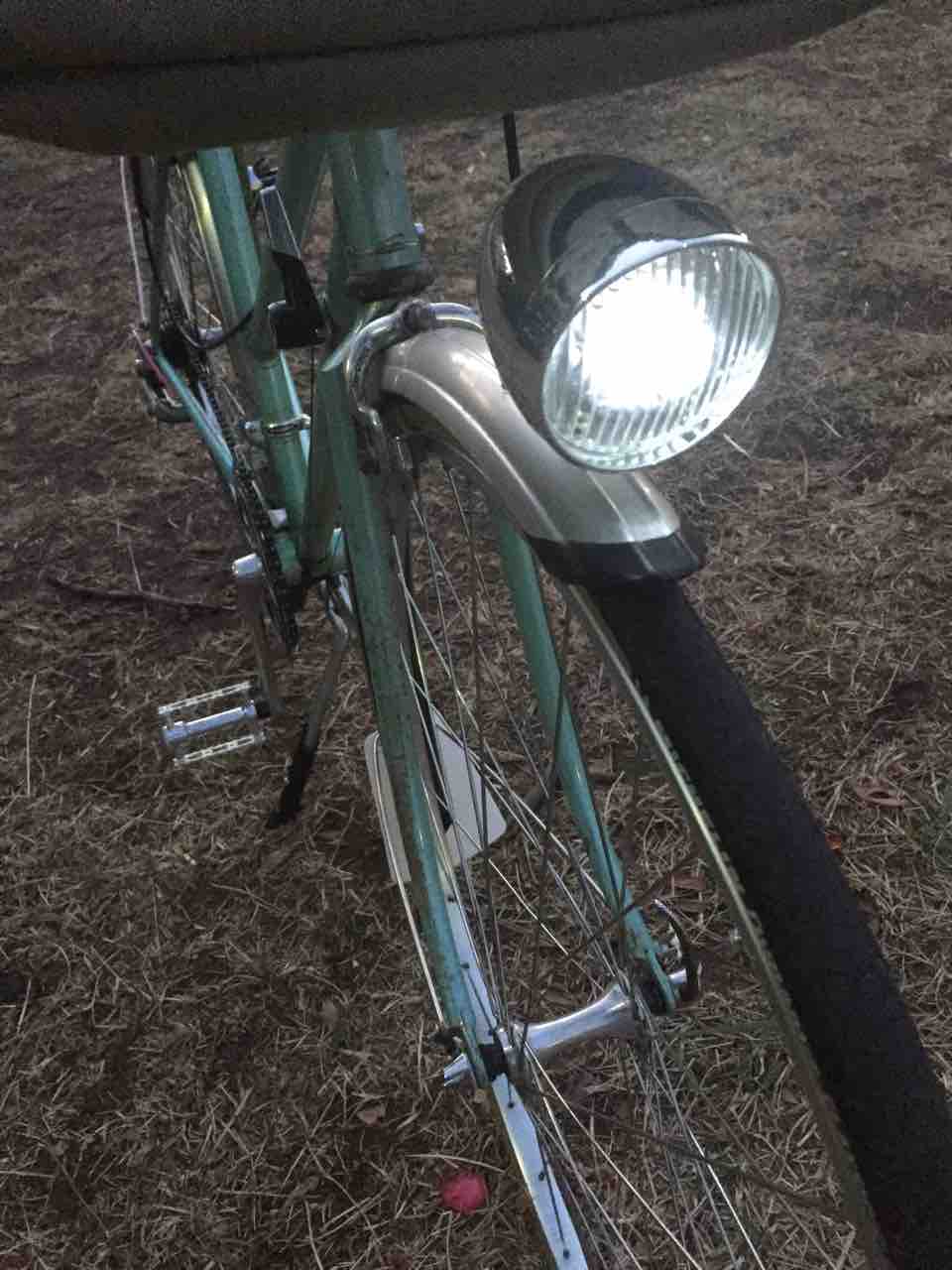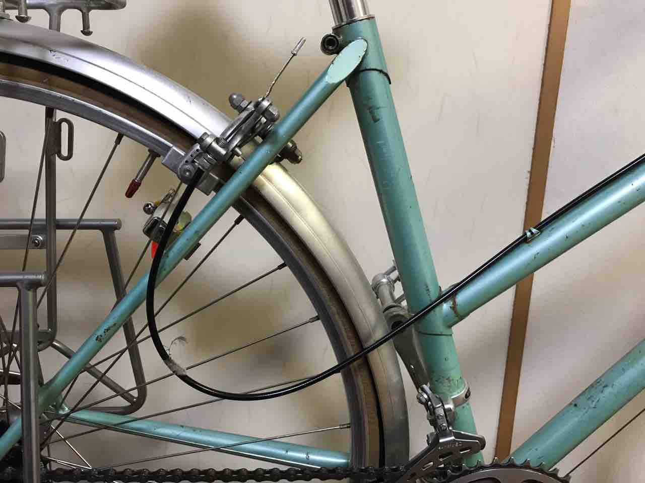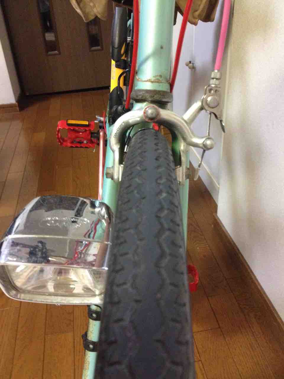 ↑ガードの先端に砲弾型ライトを付けてみた。最初の頃の赤色を配した頃から一転!ホイールを取り替えたのもこの頃だ。ハブダイナモを廃し、ウイングナット留めからクイックレリーズに変わっている。