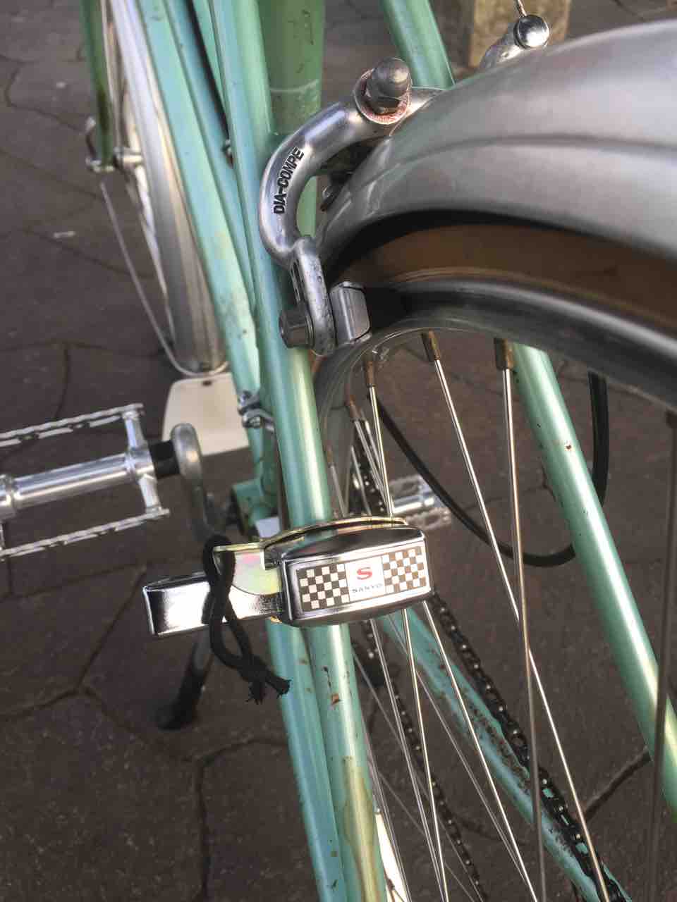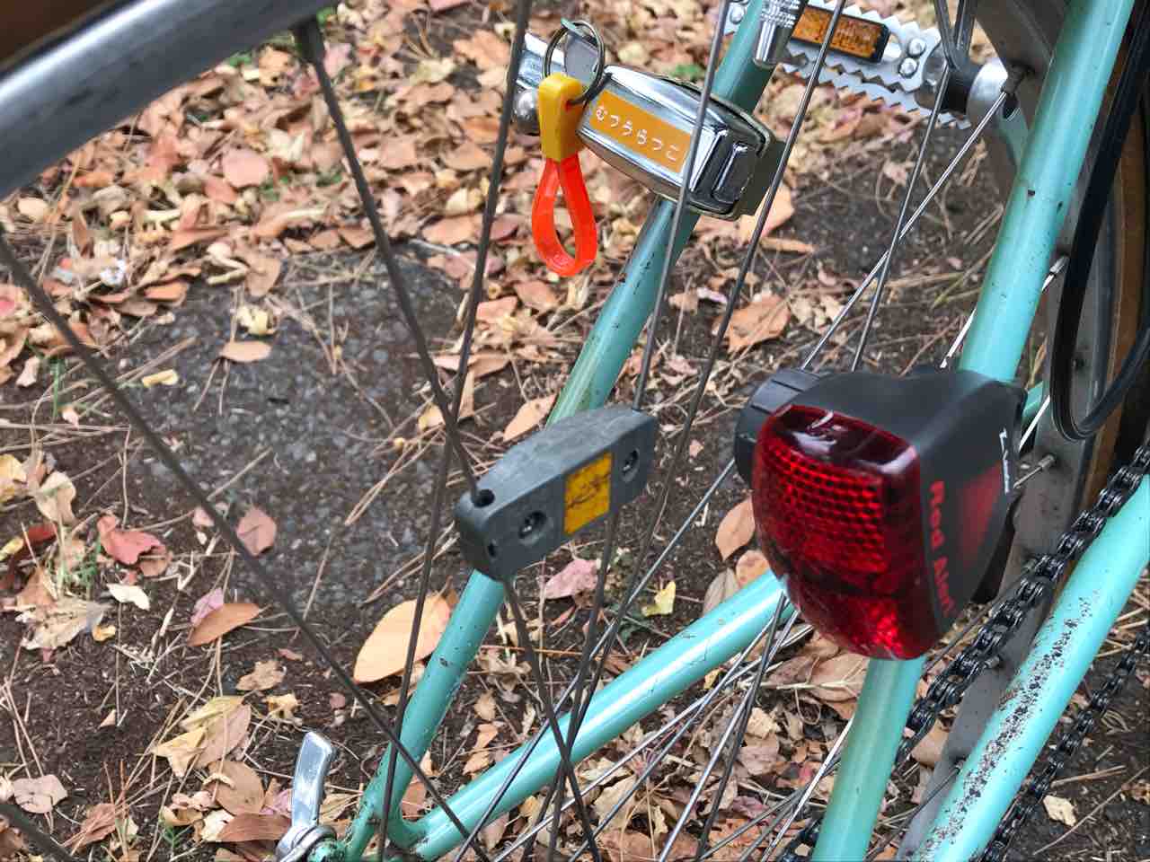 ↑右シートスティには磁石式点滅灯。スポークに取り付けた磁石がライトの位置を通過する度に1回光る仕組みだ。漕ぐ速さによって点滅の頻度が変わる。