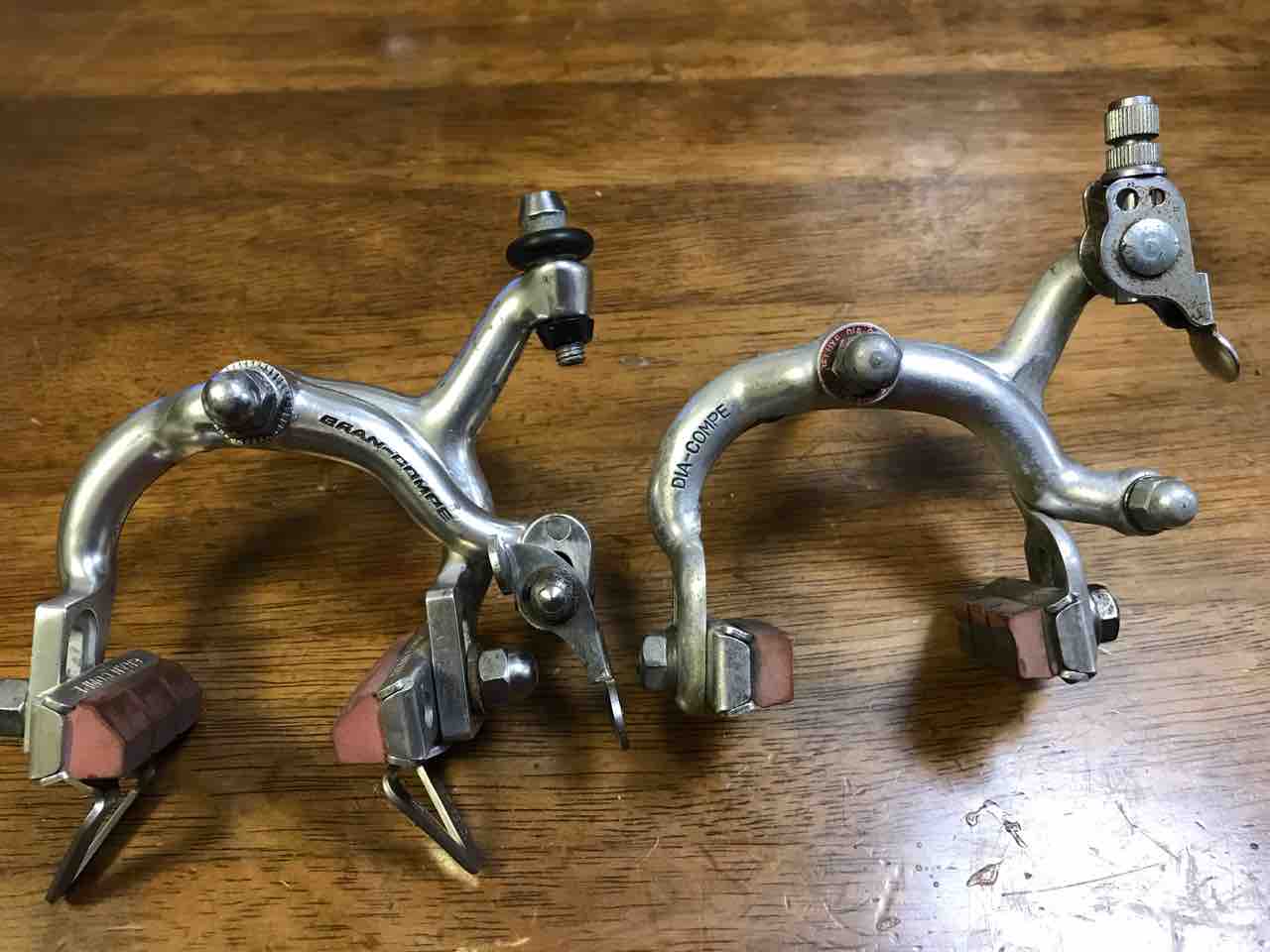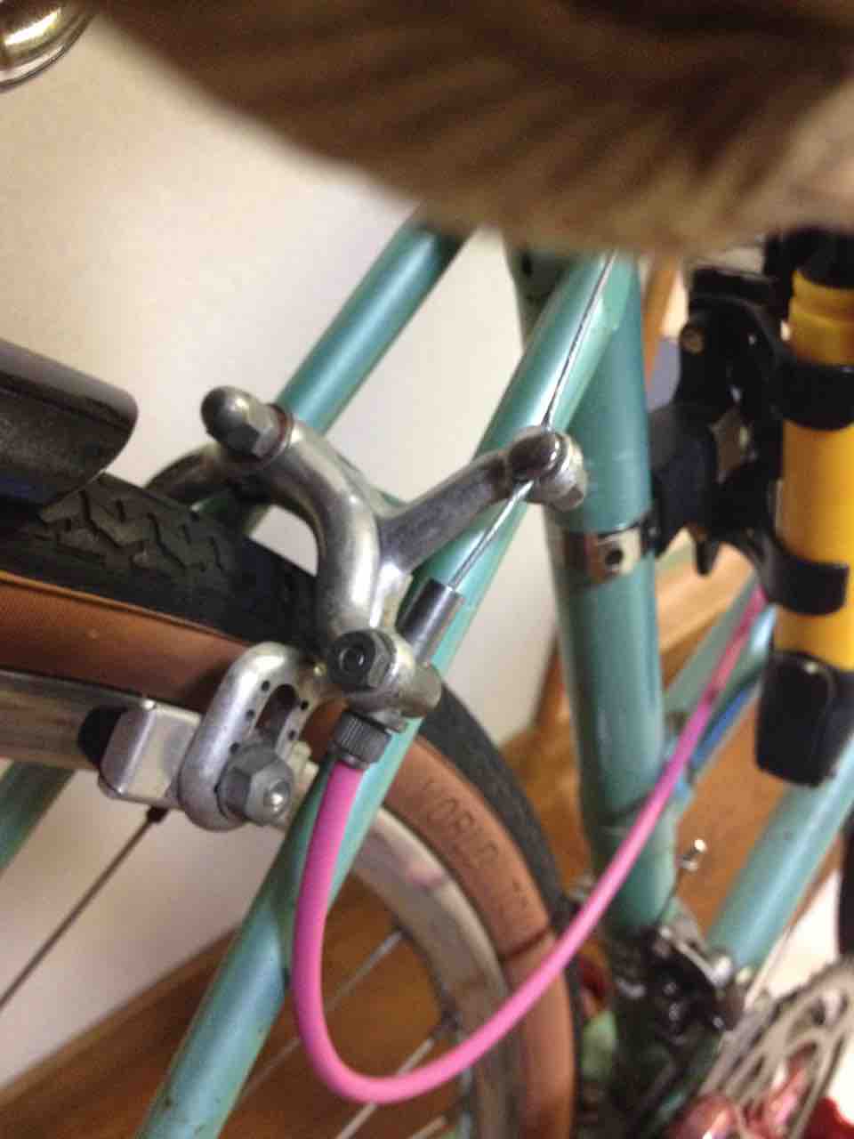 ↑次はブレーキ!A面から見た際に、このワイヤー取り回しを実現させたい。となると右支点のサイドプルブレーキとなる。左支点ならいくらでも選択肢あるが・・・