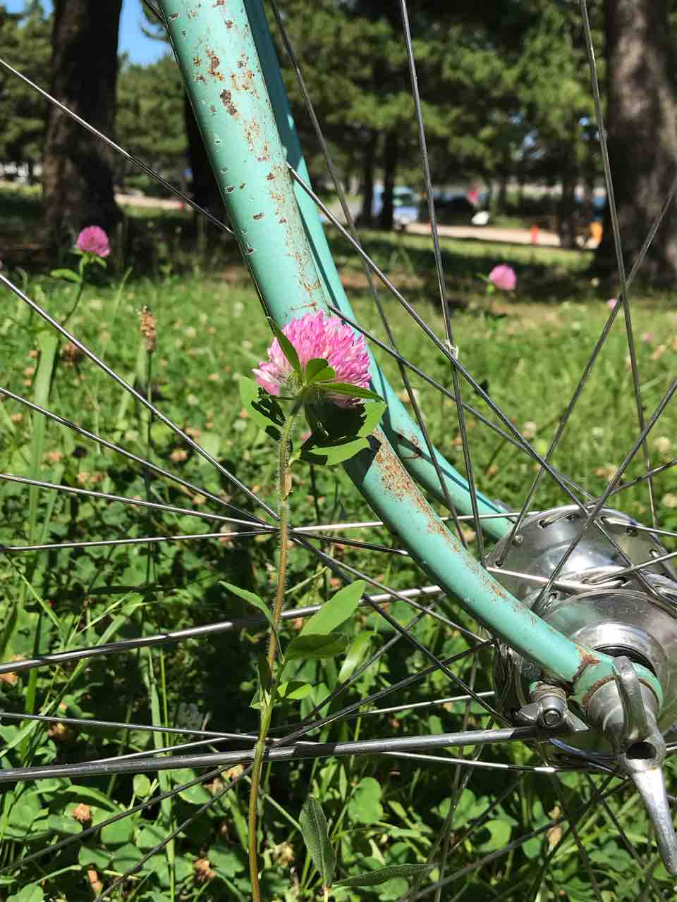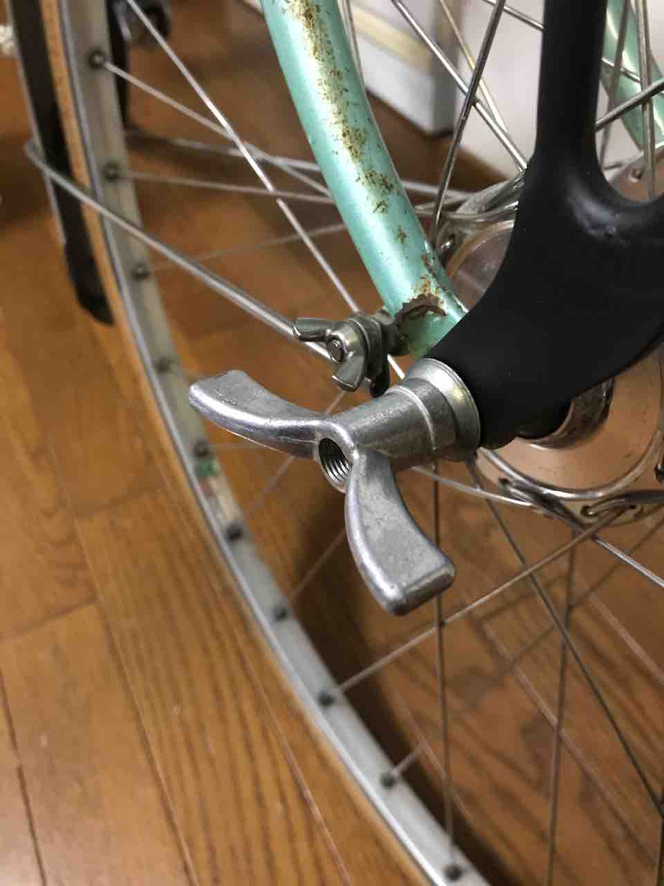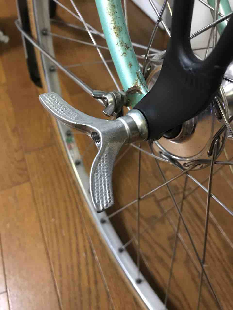 ↑ウイングナットも時々取り換えて変化?を楽しんでいる。誰が気付くかって?完全に自己満足の世界だ。前輪にトラックハブを使っているので、前後とも後輪用仕様。更に言うなら、変速機の逃げのある腰高のヤツを4個だ。コチラは杉野製。