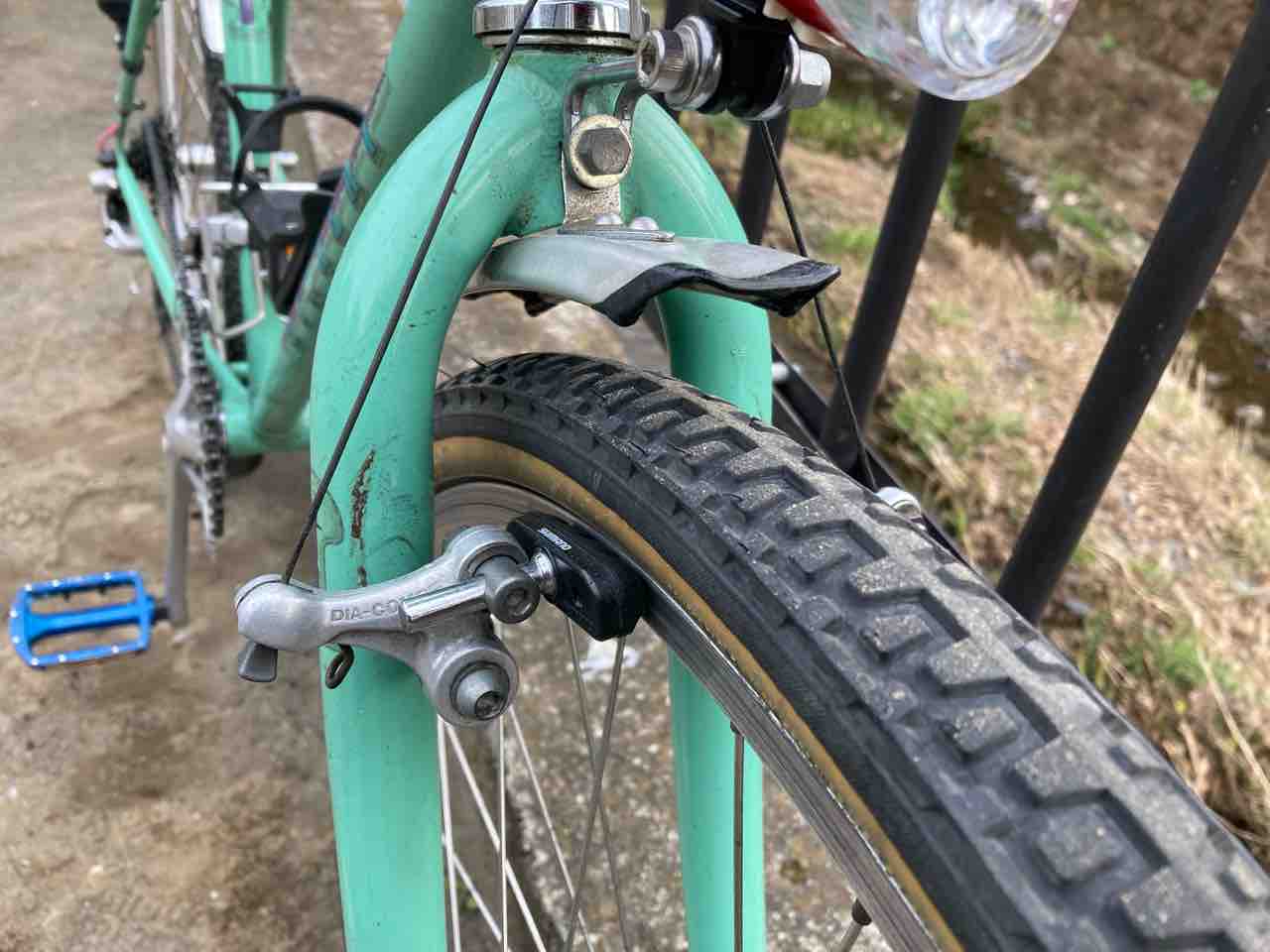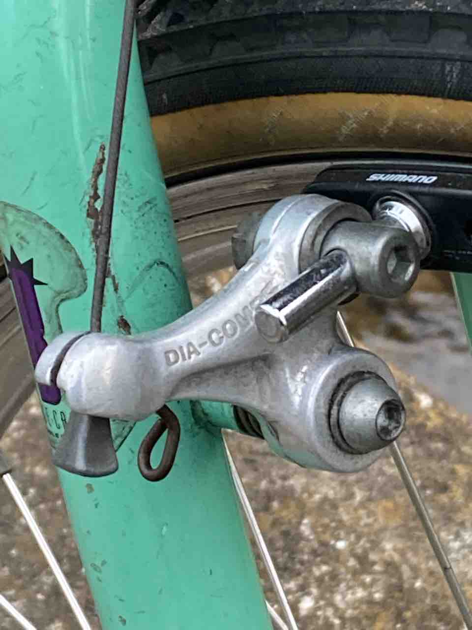 ↑Bianchi 26HEパスハンのブレーキ!DC-983である。あまり見かけないのではないかな?シューがシマノなのはご愛嬌。