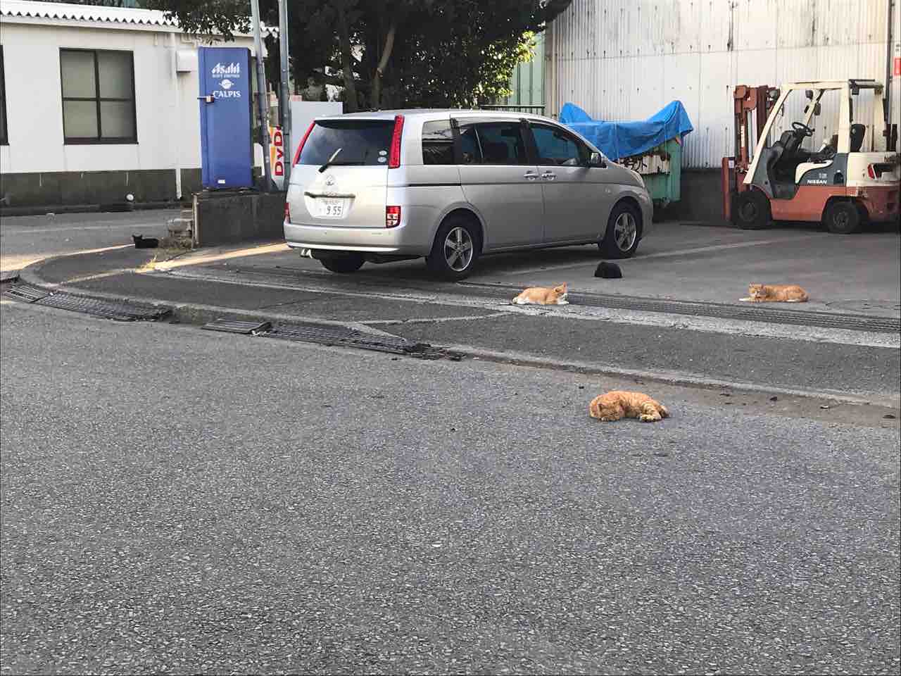 ↑にゃーの溜まり場に遭遇しました。この画像の中に5匹います。後から気がついたんですが、クルマの陰にもう1匹いました。