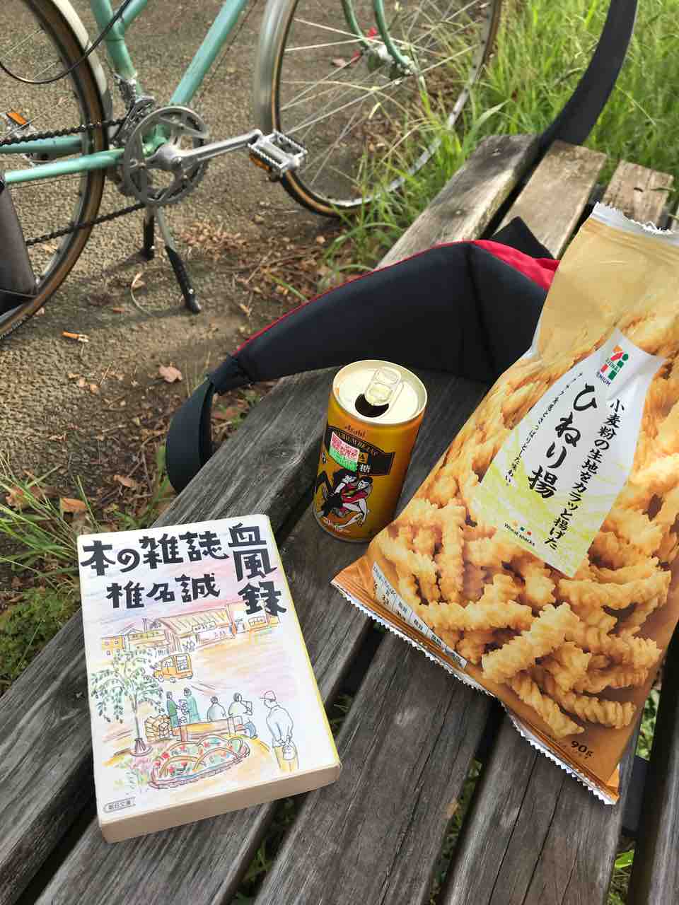 ↑気持ちの良い秋晴れとなりました。読書にはぴったりです。コンビニでコーヒーとお菓子を買ってきて、読みかけの本を暫し読み続けます。いま読んでるのは、椎名誠作 本の雑誌血風録 です。多分読み返すの3回目くらいですね。