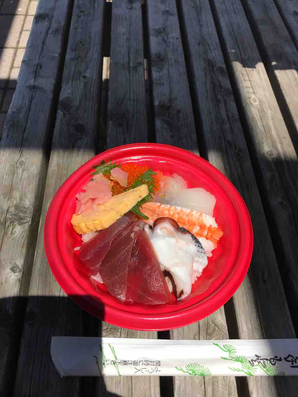 ↑お昼は 長井市場食堂 を目論んでおりました。しかしながら、長井水産の売店に顔を出したところ、まぼろしの海鮮丼がまだあるではないですか(^^) 本日は12時30分の時点で3個残ってました。予定変更です。540円税込! 残念ながらお約束のつみれ汁150円税込 は強風の為販売停止でした。富浦公園まで移動して、お気に入りのベンチでお昼にします。相変わらず風が強くて、袋やら箸やらが飛ばされます。醤油も飛沫を伴って飛ぶしで、アチコチ醤油だらけです。ガチャん!と音がした方を見ると、Norton650Aは倒れてました(-_-)