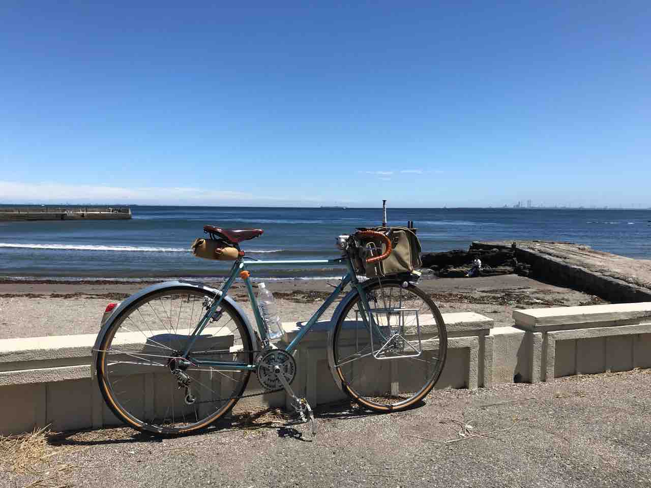 ↑走水海岸にて。久しぶりに帆布製のフロントバッグを装着してみました。BRIDGESTONEの純正品 1976・12・7と購入した日付が入ってます。減価償却も完了してます。